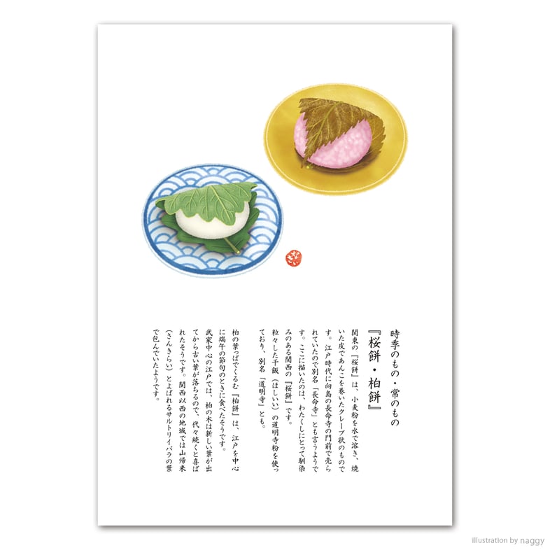 この季節にあったお菓子をと思い、今回のzineのために描いた「時季のもの・常のもの」のページの『桜餅・柏餅』をご紹介します。