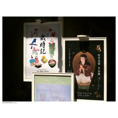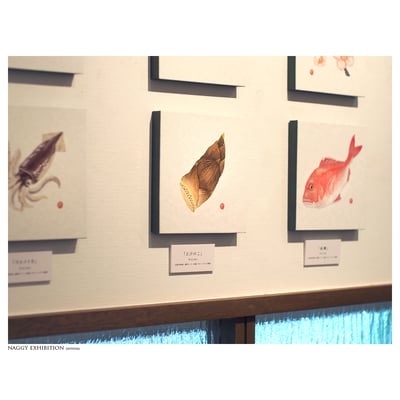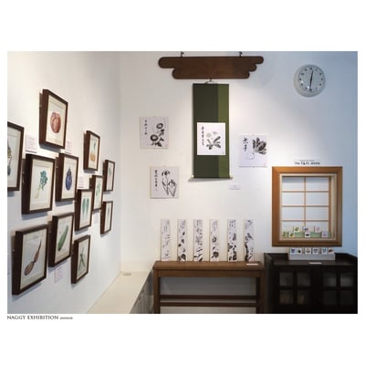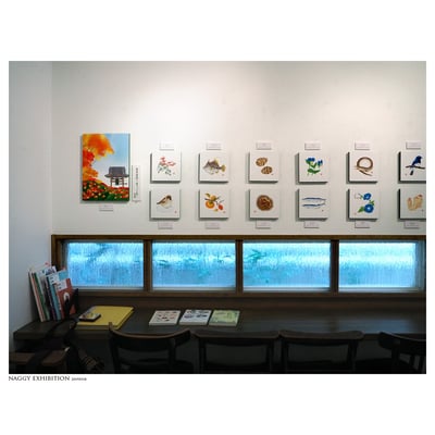 以前作りましたnaggyオリジナルzine『なぎぃ歳時記』に掲載したイラストを中心に展示いたしました。春夏秋冬の花鳥や魚、行事にまつわるものや食べ 物のイラストと、二十四節気や七十二侯などの和の暦や季語などの手書き文字をあわせて、今回の展示のために改めて描き直し、naggyなりの歳時記を展示いたしました。また描き下ろしの新作も多数展示いたしました。