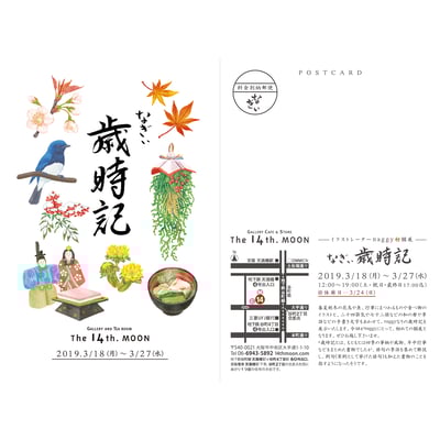 2019年3月18日(月)〜27日(水)まで、大阪天満橋・谷四のギャラリーThe 14th.MOONさんで、作品展『なぎぃ歳時記』が開催されました。naggyにとっての初個展でした。たくさんの方々がお越し下さいまして、盛況のうちに開催終了いたしました。その展覧会会場の様子の一部をご紹介いたします。